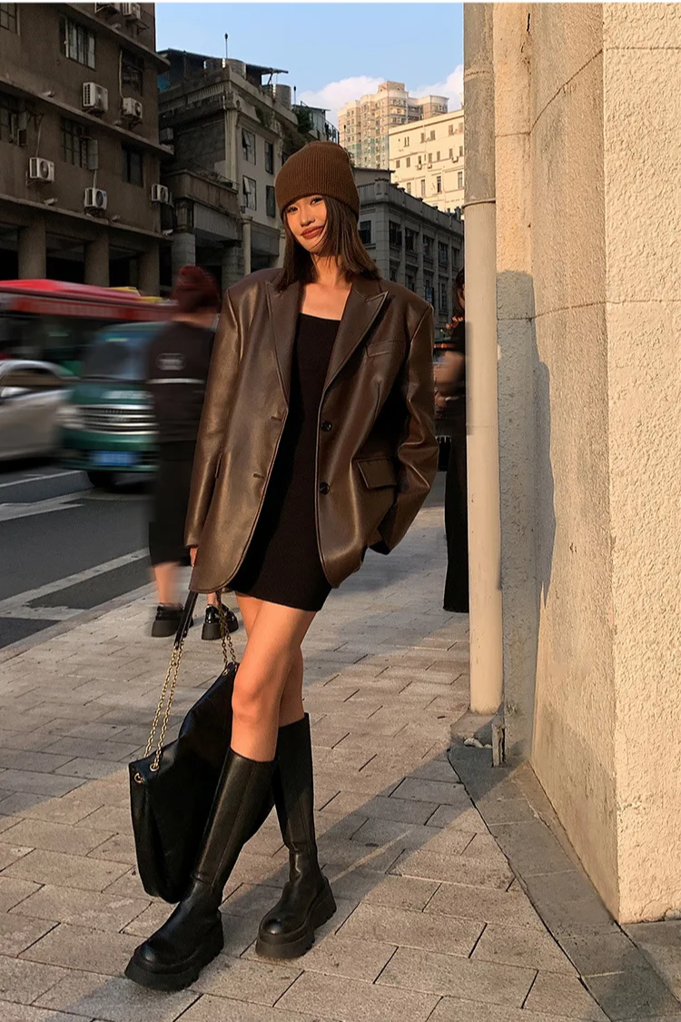 Stylový hnědý, volně padnoucí blazer z PU kůže - Yaira