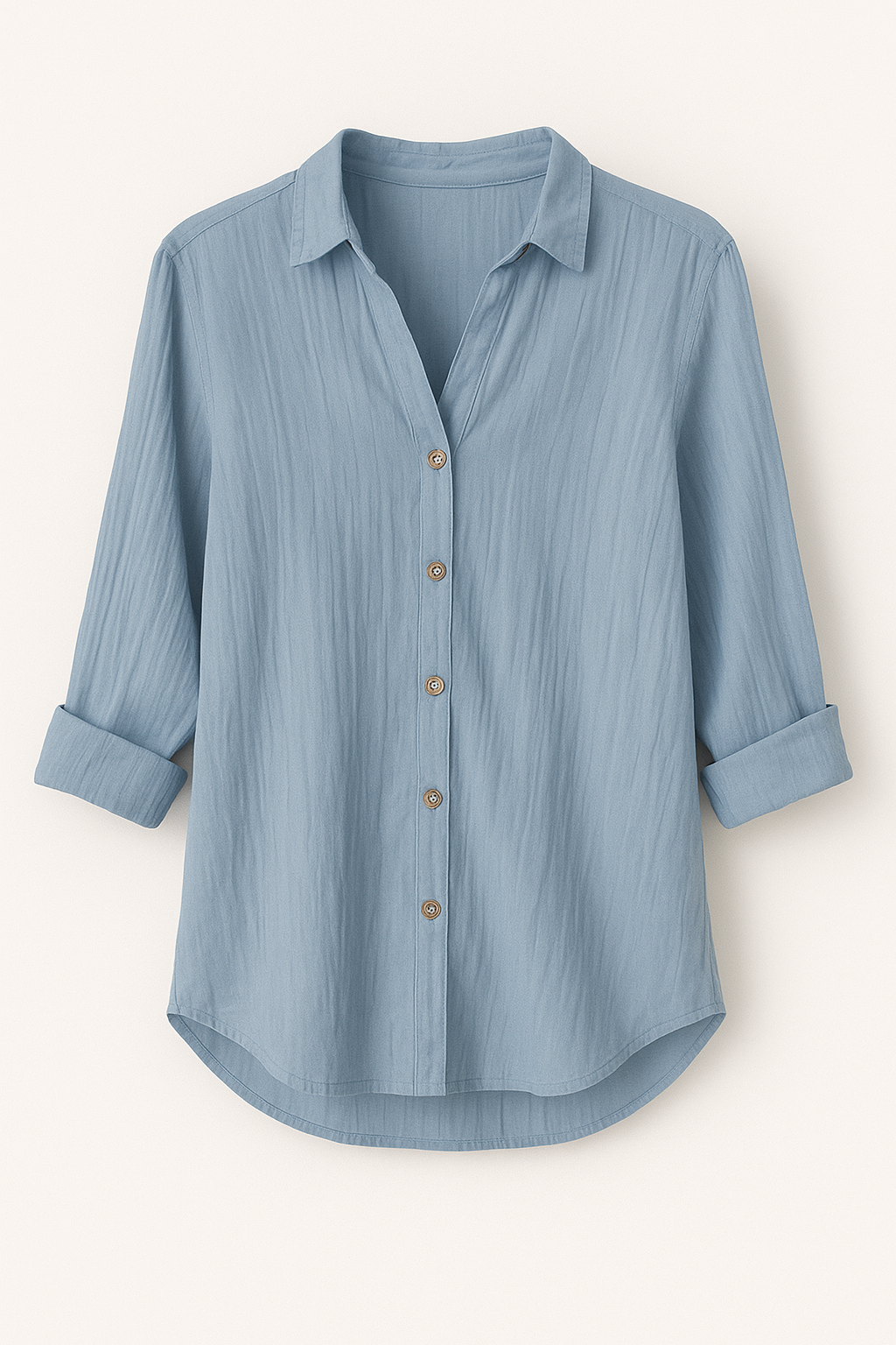 Volný střih zajišťuje příjemný pocit při nošení, zatímco lehce strukturovaná látka padá vzdušně. Ať už nošená otevřená přes top nebo jako samostatný vršek – tato halenka se flexibilně přizpůsobí tvému stylu.
