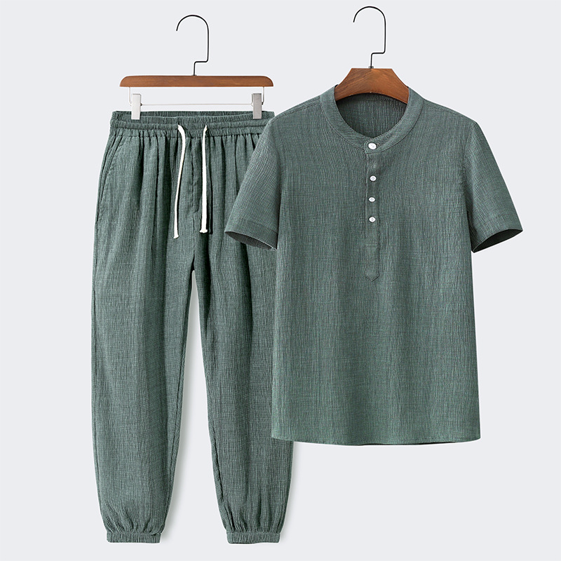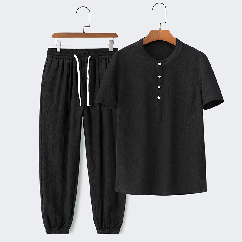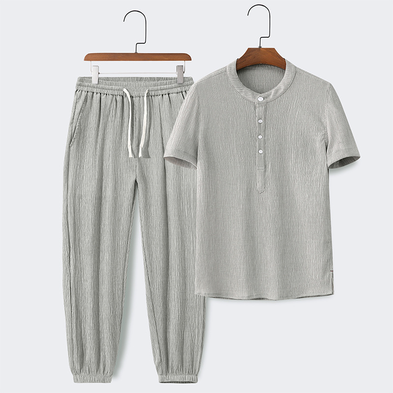 Devako Men's Summer Standing Collar Short Sleeve T-Shirt and Pants Set nabízí dokonalou rovnováhu mezi stylem a pohodlím v horkých dnech