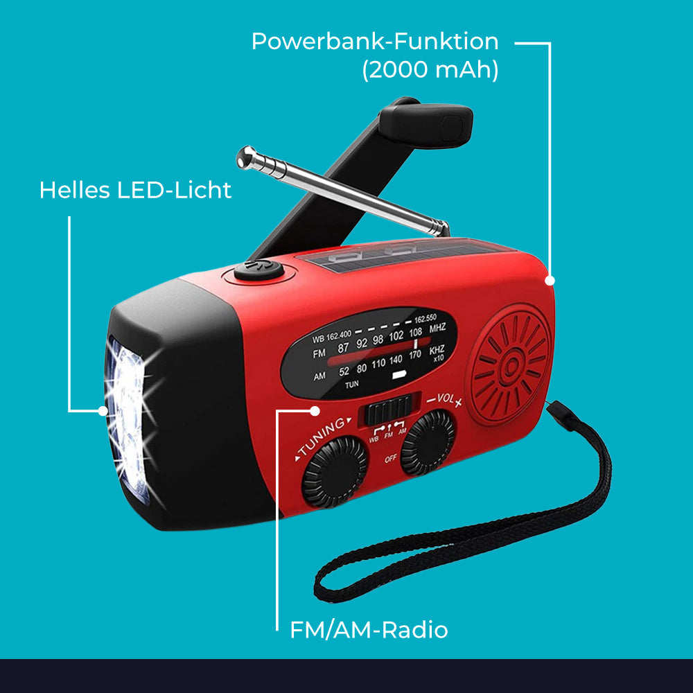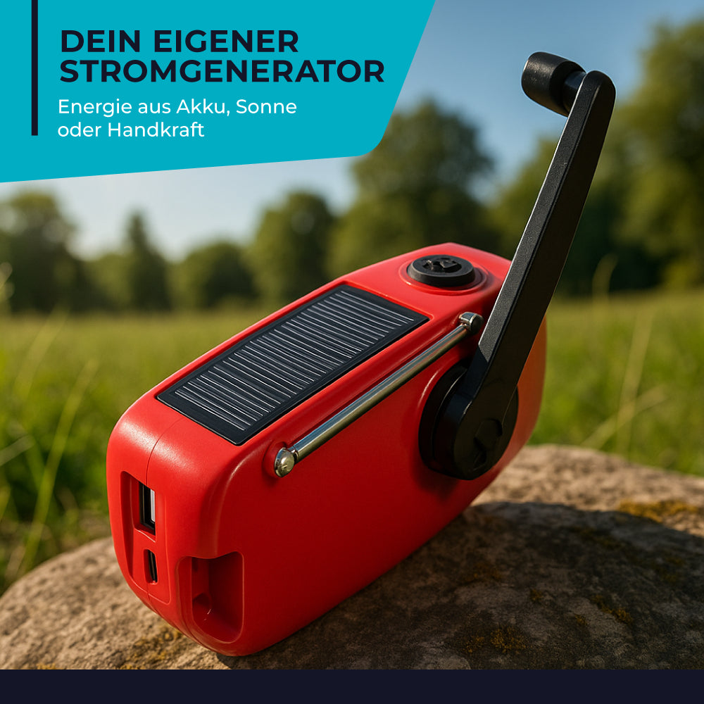 Je baterie vybitá? Žádný problém: Nabij Dynox jednoduše přes vestavěný solární panel nebo ruční klikou – kdekoliv, kdykoliv. Už 1 minuta klikání stačí na až 30 minut světla nebo rádia.