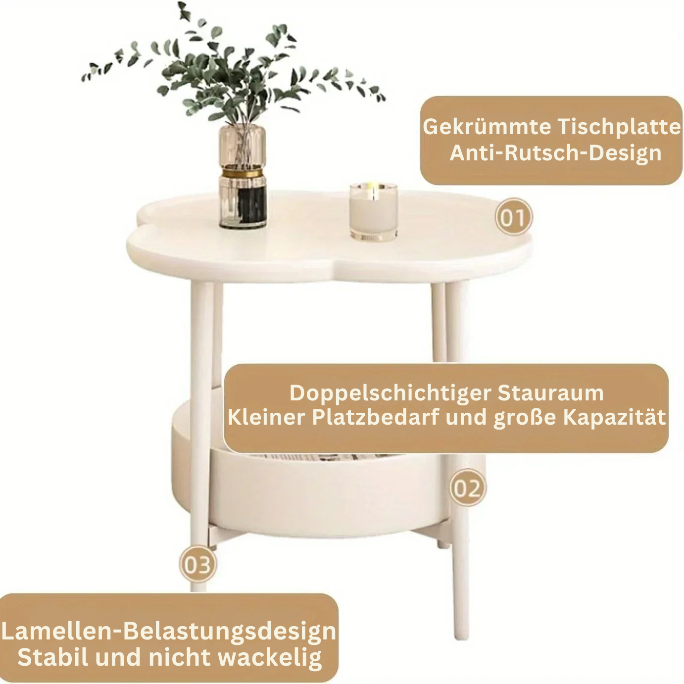Stylový & stabilní – Elegantní tvar trojlístku s krémově bílým povrchem a stabilní X podporou