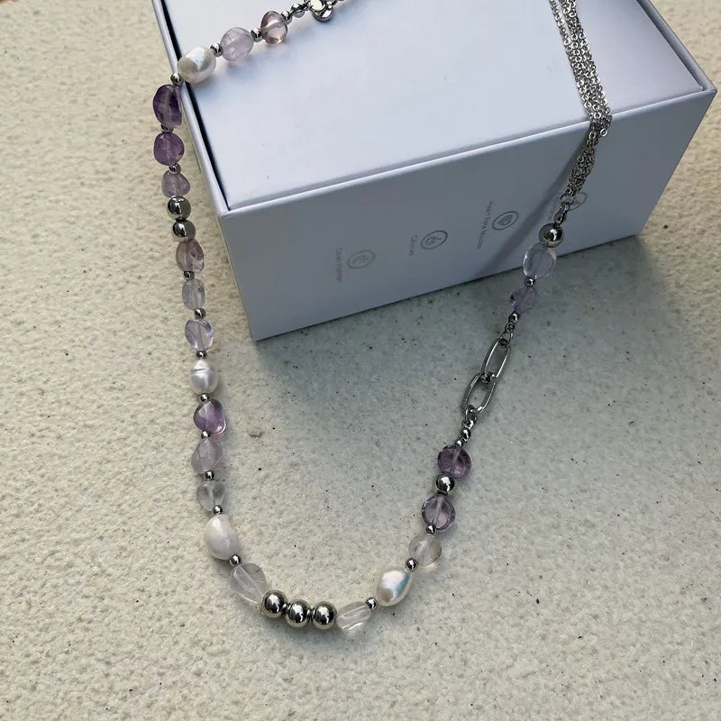 AquaBelle-halskæden forener naturlige blå krystaller med barokke ferskvandsperler til et elegant smykke til damer.
