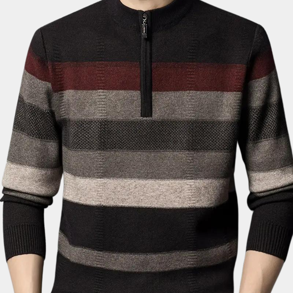 Her har du vores strikkede, stribede sweater fra Renon til herrer. Denne sweater er både behagelig og stilfuld til at gå ud i, men også til hjemmebrug på sofaen. Sweateren er lavet af et behageligt stof, der er egnet til forår, efterår og vinter.