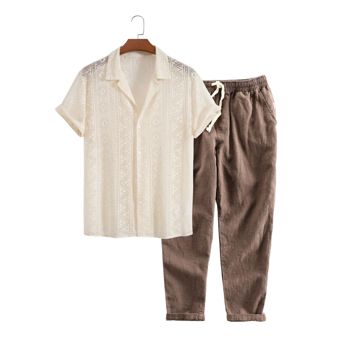 Devako krátky rukáv košeľa s geometrickou štruktúrou a ľanovo-bavlnené nohavice pre mužov
