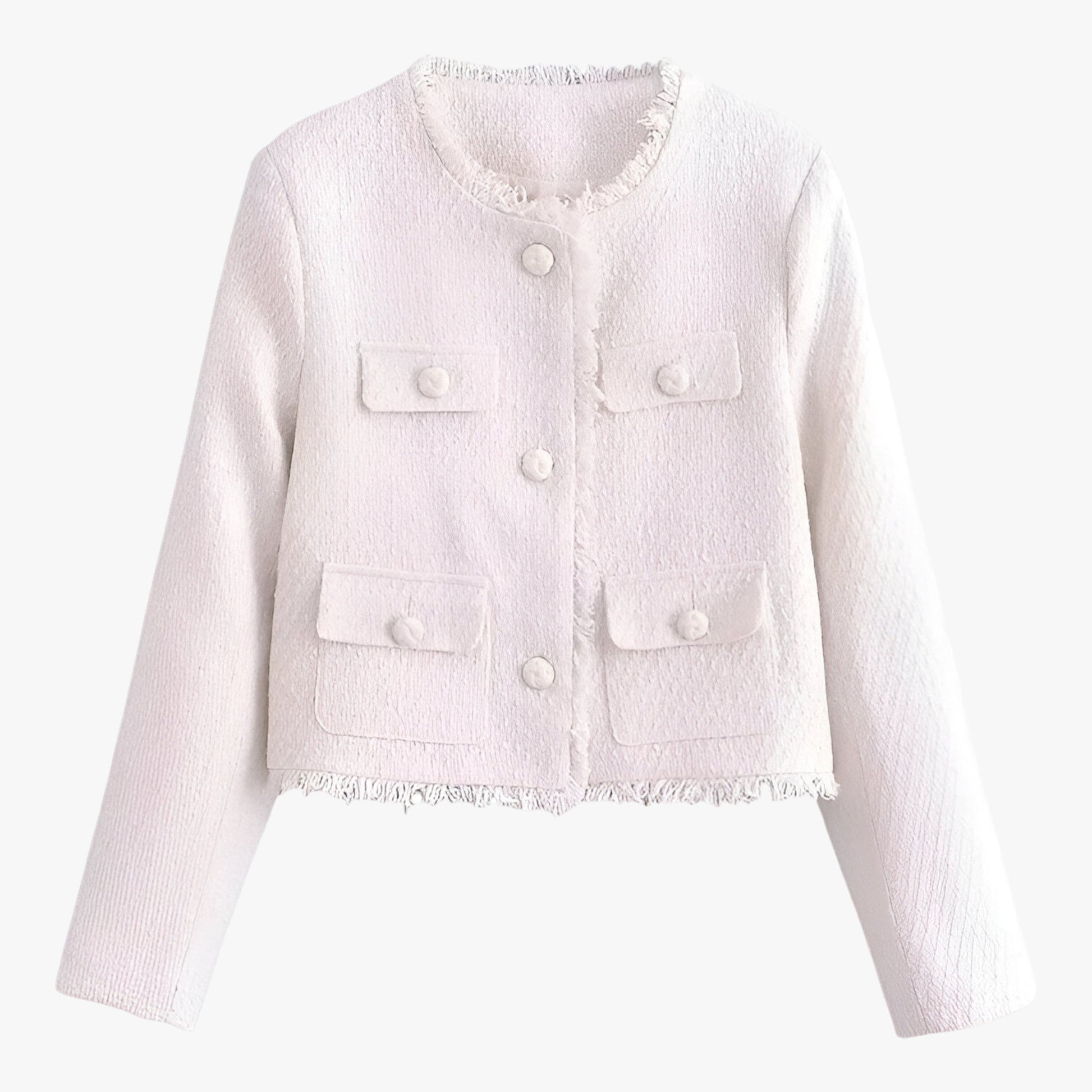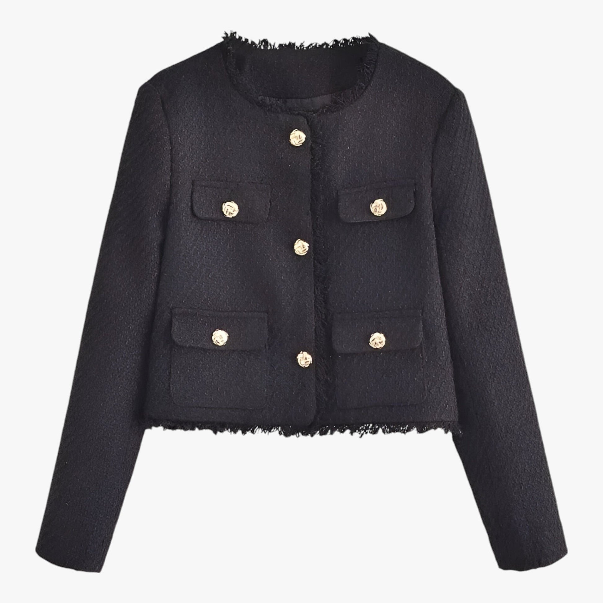 Elegantná krátka tweedová bunda je perfektným spoločníkom na chladnejšie jesenné dni