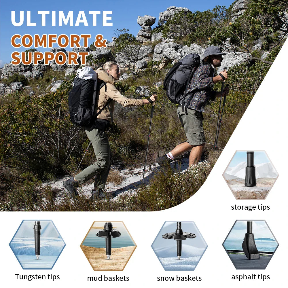 Naše ľahké turistické palice z karbónového vlákna ponúkajú dokonalé riešenie. Sú navrhnuté tak, aby zlepšili tvoj zážitok z turistiky a poskytli vynikajúcu podporu a stabilitu. Či už chceš túrovať blízko domova alebo absolvovať náročnú trasu, naše palice sú tvoj ideálny spoločník. Ergonomický dizajn tlmí nárazy a robí každý krok pohodlnejším, takže si môžeš užiť svoje dobrodružstvo dlhšie a ďalej.