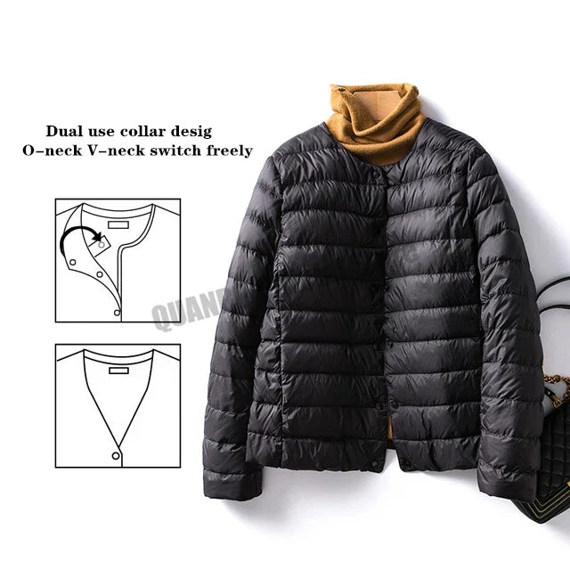 Zvýraznite svoj zimný štýl s touto nevyhnutnou perovou bundou, ktorá je vybavená všestranným výstrihom do V, ktorý jej dodáva nádych rafinovanosti. Bezgoliérový dizajn vás udrží módne v obraze a zároveň poskytuje pohodlie a teplo v chladných dňoch. Toto nie je len bunda; je to váš favorit, keď ide o to zostať v teple, elegantný a absolútne trendy.