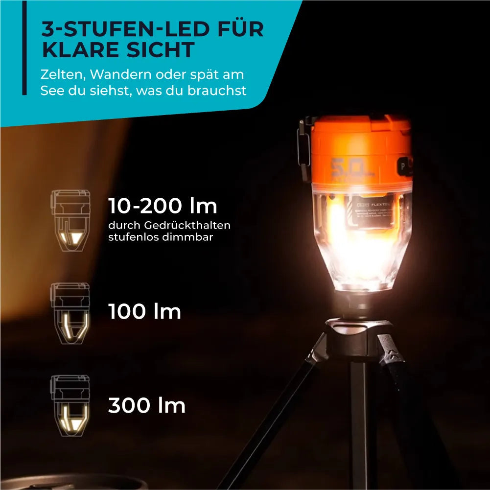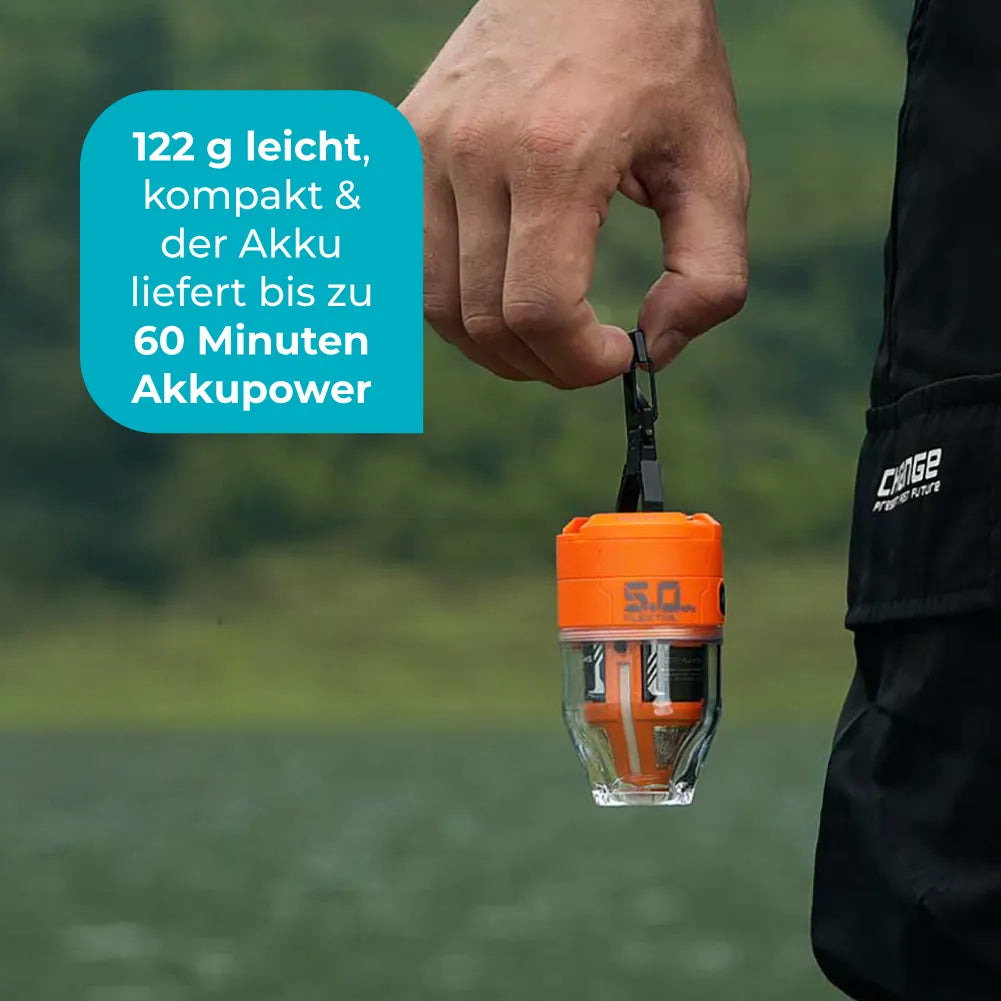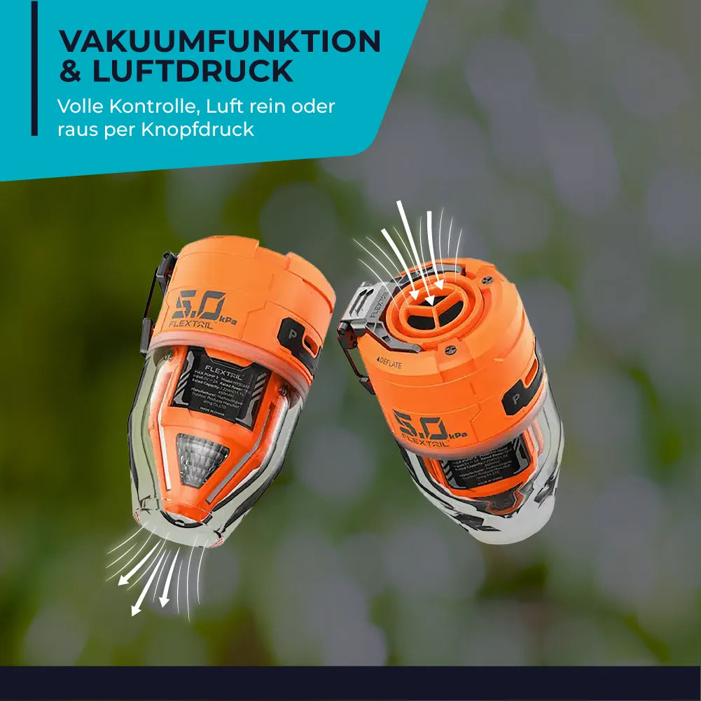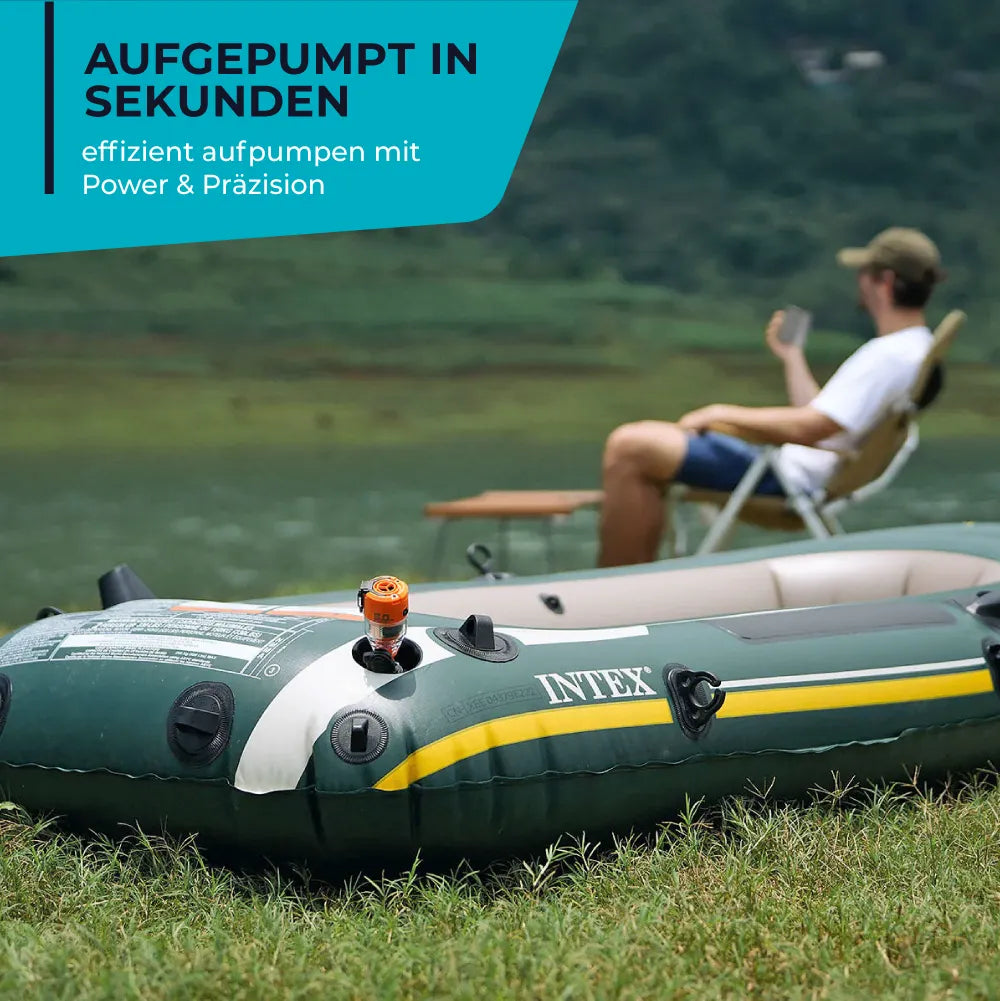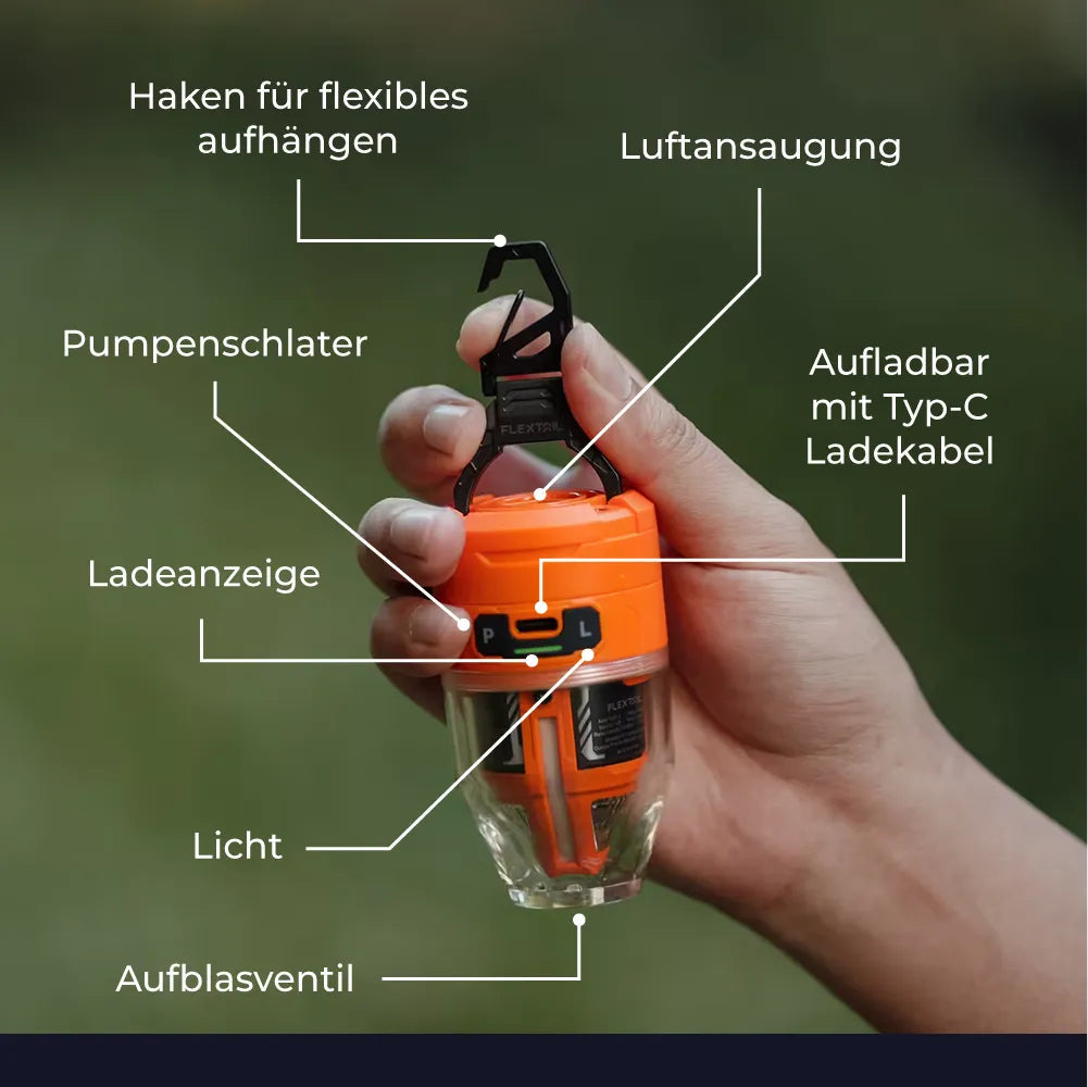 S šiestimi tryskami je pumpa vhodná takmer na všetko: plávacie pomôcky do bazéna, nafukovacie vankúše, vakuové vrecká alebo statívy. Výkonná batéria poskytuje až 60 minút prevádzky a dá sa pohodlne nabíjať cez USB-C. Navyše trojstupňové LED svetlo (hlavný, okolitý a kombinovaný režim) zabezpečuje orientáciu – ideálne na nočné outdoorové aktivity.
