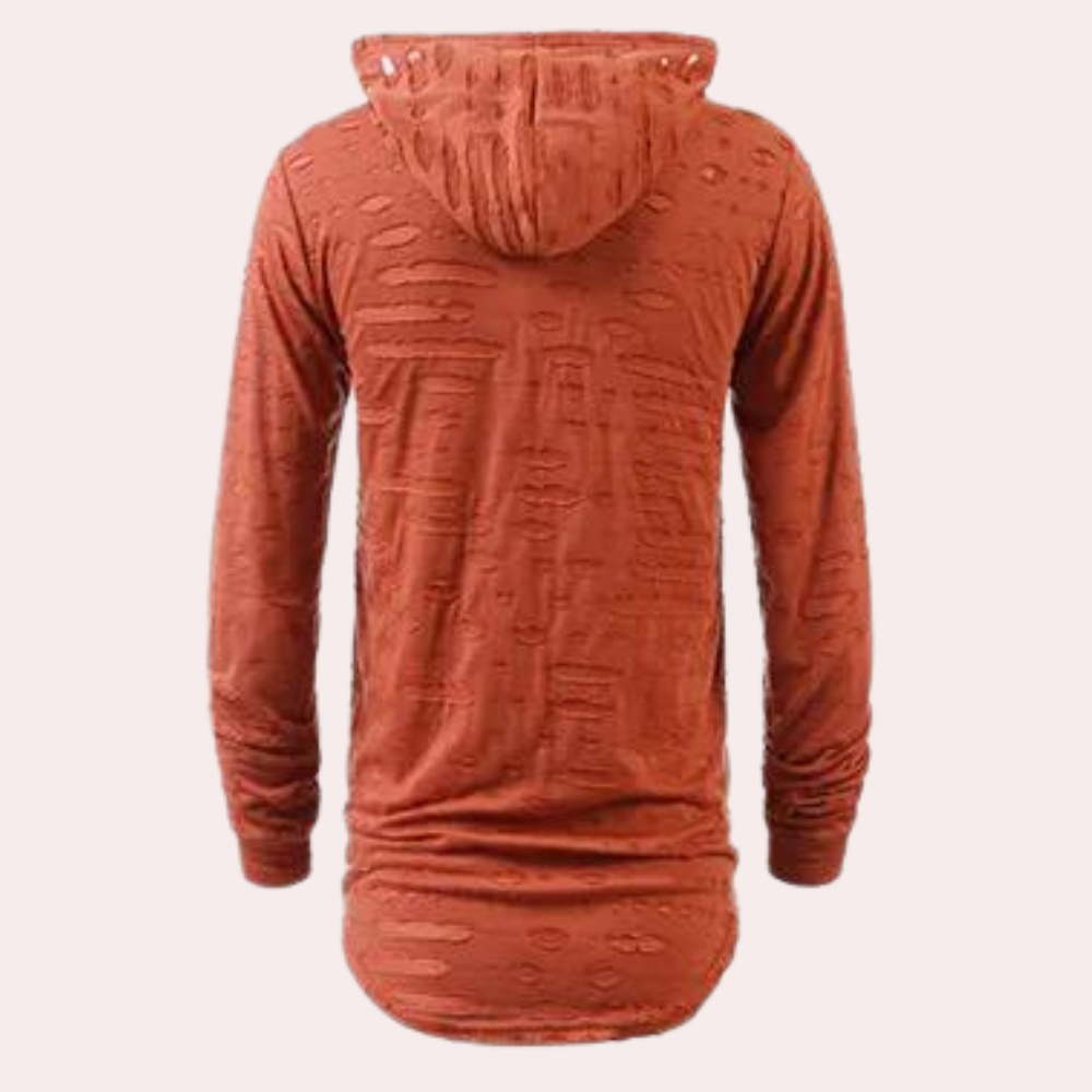 Pompiliu Ripped dlhý pánsky kapucňový pulóver v Ripped vzhľade kombinuje moderný, drsný vzhľad s uvoľneným pohodlím.
