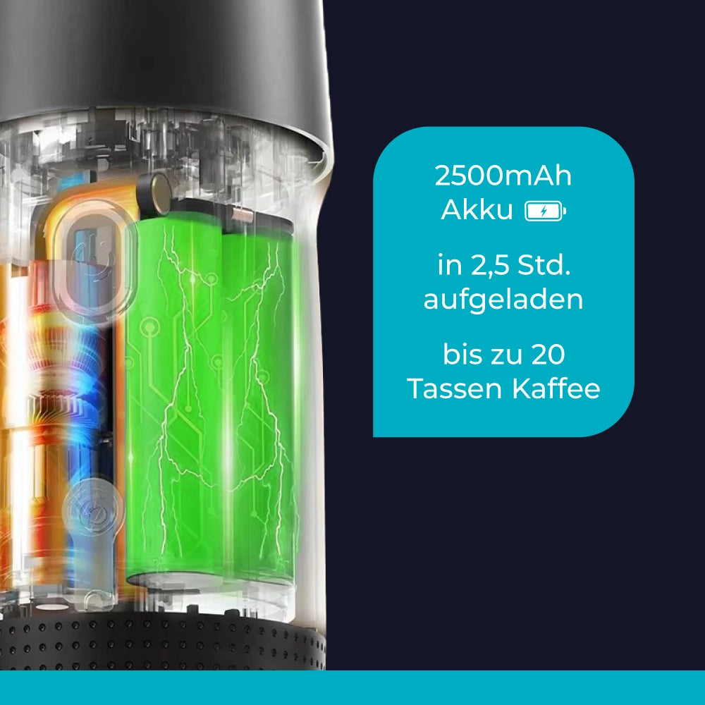 Prenosná kávovar funguje bez zásuvky alebo ďalších batérií. Výkonná 2500mAh batéria sa nabije za iba 2,5 hodiny a vystačí na až 20 šálok kávy – ideálne na cesty, do kancelárie alebo na kempovanie.